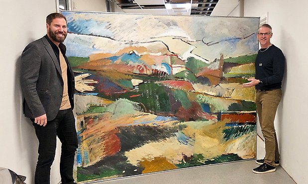 Robert Fransson och Tobias Leverin med tavlan av Göte Sällström som kommunstyrelsen mottagit i gåva.