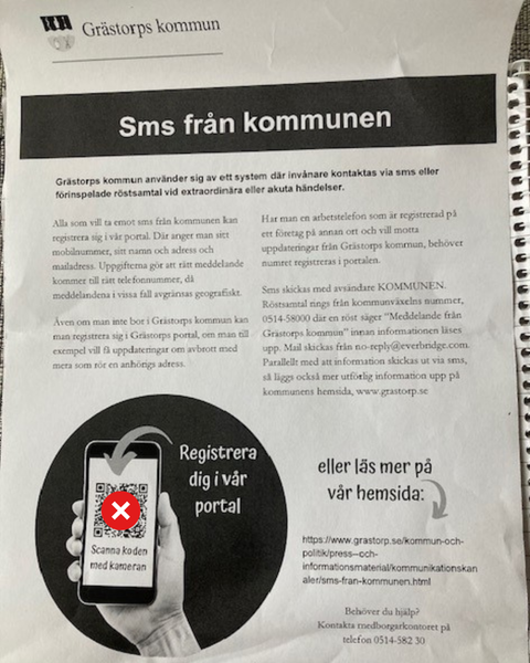 Vi har fått kännedom om att informationsblad med falska QR-koder på har delats ut i brevlådor med uppmaning att registrera sig för kommunens sms-tjänst.